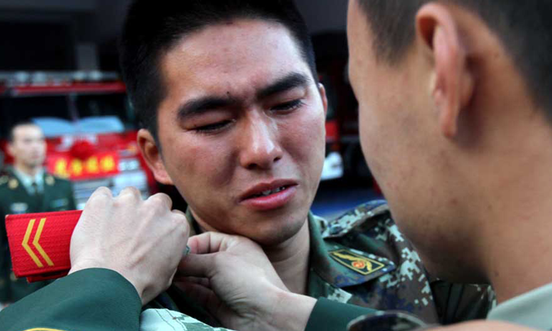 An Armed Police officer from the Xiamen firefighting division removes the shoulderstrap ranks from a discharged soldier on November 25, 2013. Hold back your tears, comrade, your honor will never fade. figcaption >