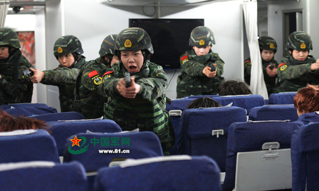 Female Armed Polices train in anti-hijacking simulations in a training plane cabin on March 23. figcaption >