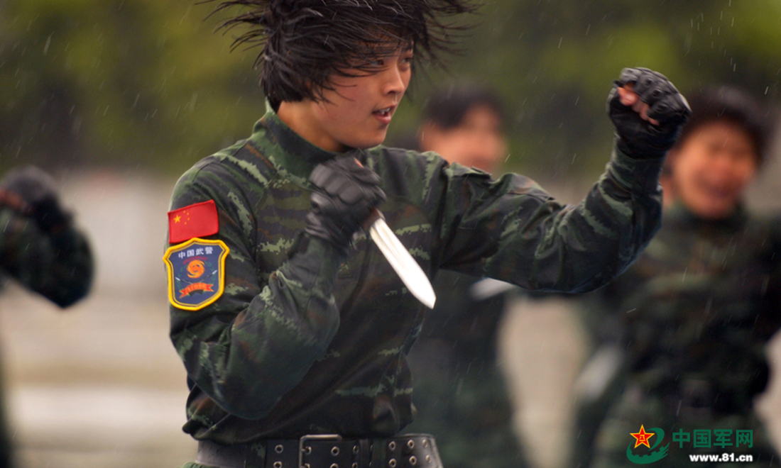 Women from the Sichuan Armed Police practice martial arts in the rain. They are not inferior in any respect compared with the Falcon Commandos. figcaption >