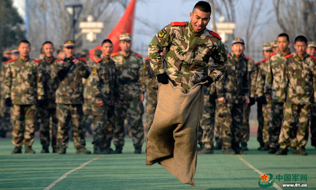 The Armed Police camp can be a place of joy. An Armed Police soldier takes part in sack race. figcaption >