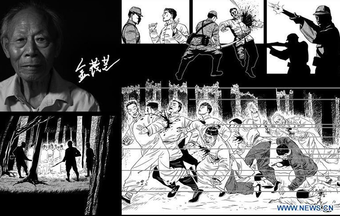The combo picture shows the portrait, signature of Li Gaoshan and illustrated story reviving his tragedy based on facts. Born on Feb. 24, 1925, Li is a survivor of Nanjing Massacre, a heinous crime committed by the Japanese militarists during World War II in 1937, in Nanjing, then capital of China. In the winter of 1937, then 13-year old Li served as a soldier guarding Nanjing. After handing over his arms and surrendered, he and hundreds of his battle companions were escorted to enclosed houses, then confronting with wild machine gun blasting and massive fire. Almost every bare-handed prisoner of war there died on the spot, most fortunately, Li survived thanks to his short stature. The year 2017 marks the 80th anniversary of the Nanjing Massacre, in which more than 300,000 Chinese were killed by the Japanese invaders who occupied Nanjing on Dec. 13, 1937, marking the start of six weeks of destruction, pillage, rape and slaughter in the city. There are only less than 100 living survivors of the atrocity. Reporters from Xinhua spent many years to look for the survivors of Nanjing Massacre and record their current lives. Photo: Xinhua figcaption >