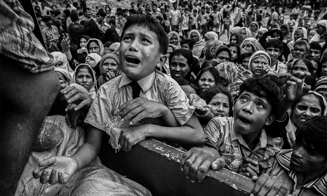 A Rohingya boy cries as he climbs a truck delivering aid to the refugee camp in Cox’s Bazar, Bangladesh on September 20. More than half a million Rohingya refugees have flooded into Bangladesh since August 25, 2017 when renewed fighting broke out between militants and the Myanmese military. Photo: Kevin Frayer/Getty Images/VCG figcaption >