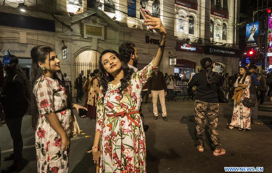 A woman takes a photo during New Year's celebrations in Kolkata, India on December 31, 2017. Photo: Xinhua figcaption >