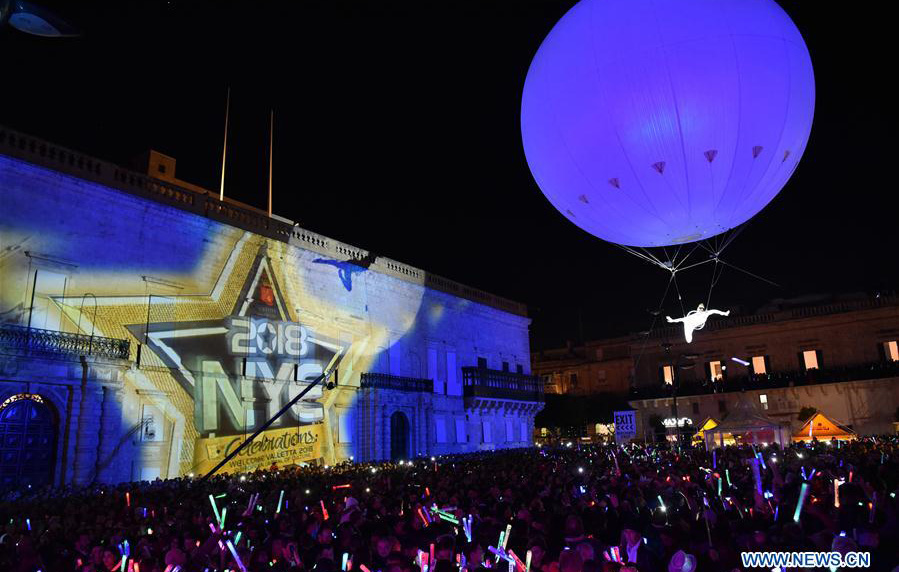 A New Year’s celebration kicks off at the Grandmaster’s Palace in Valletta, Malta on December 31, 2017. Photo: Xinhua figcaption >