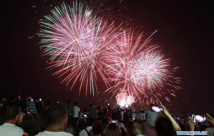 People admire a New Year's fireworks show in Pasay, the Philippines on December 31, 2017. Photo: Xinhua figcaption >