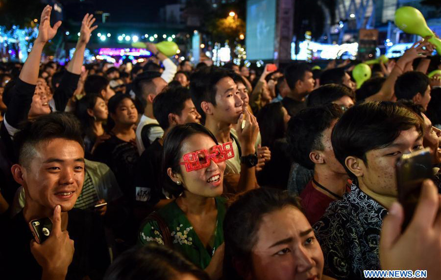 Revelers watch a countdown to New Year’s in Bangkok, Thailand on December 31, 2017. Photo: Xinhua figcaption >