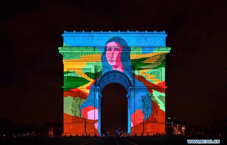 A Mona Lisa inspired image is projected on the Arc de Triomphe as part of the New Year’s celebrations in Paris, France on December 31, 2017. Photo: Xinhua figcaption >