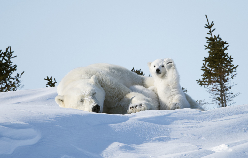 A polar bear cub appears to wave at the camera next to its napping mother at Lake Manitoba, Canada on March 6, 2015. Photo: VCG figcaption >