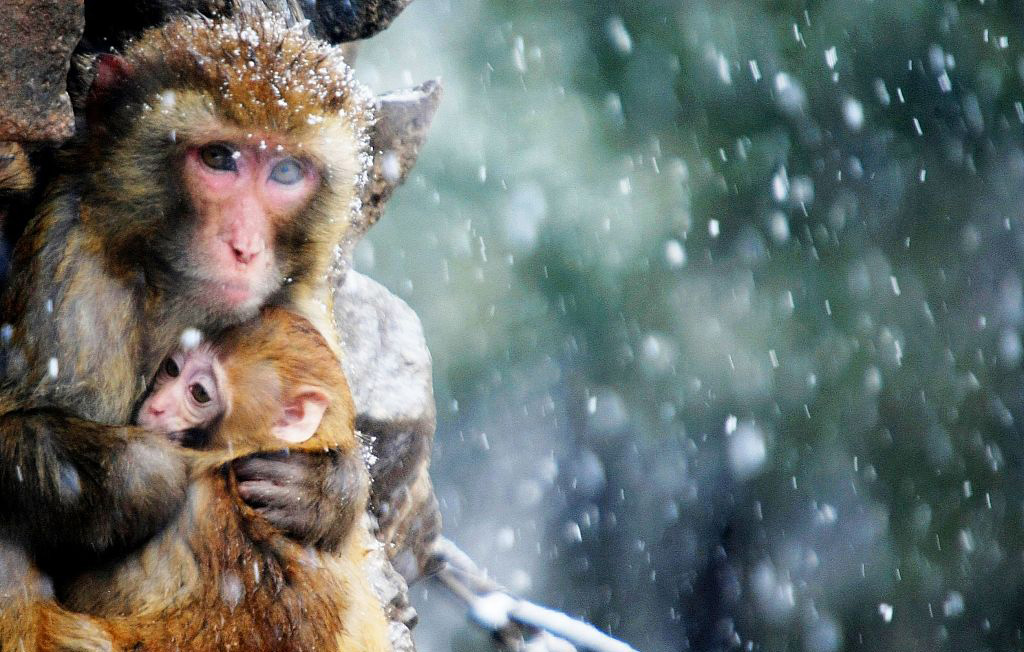 A monkey keeps her baby warm at Xiangshan Park, Huaibei, Anhui Province on January 19, 2018. Photo: VCG figcaption >