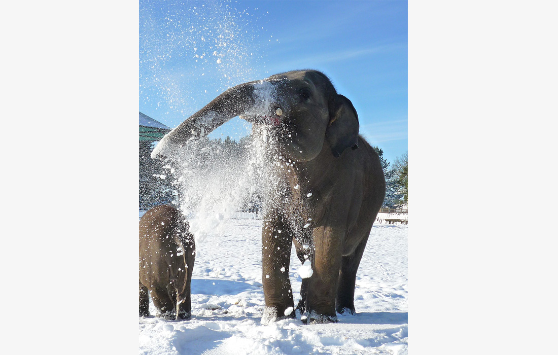 Kaylee and Donna the elephants enjoy a jumbo snowball fight at Whipsnade Zoo in Dunstable, the UK on January 8, 2010. Photo: VCG figcaption >