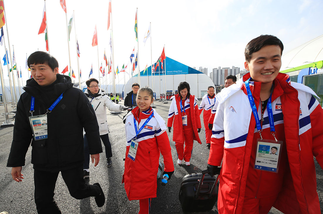 North Korean figure skaters go back to the Olympic village in Gangneung after first training. Photo: VCG figcaption >