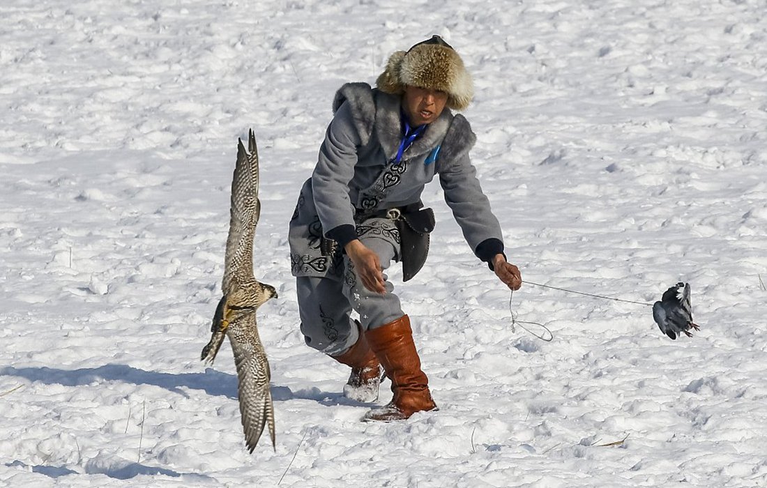 A hunter and his trained hawk compete in the competition at the Almaty Hippodrome, Kazakhstan on February 10, 2018. Photo: VCG figcaption >