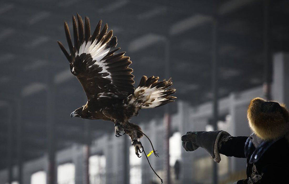A hunter releases his tamed golden eagle at an annual hunting competition at the Almaty Hippodrome, Kazakhstan on February 10, 2018. Photo: VCG