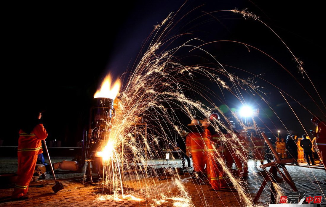 Sparks spew from a furnace during a “beat the iron flower” performance in Yongjing county, Northwest China’s Gansu Province on February 8. Such performances reached their peak in popularity during the Ming (1368-1644) and Qing (1644-1911) dynasties as a way for local blacksmiths to show off the strength of their iron works. They were also performed to celebrate holidays and other festive occasions. Photo: Xinhua figcaption >