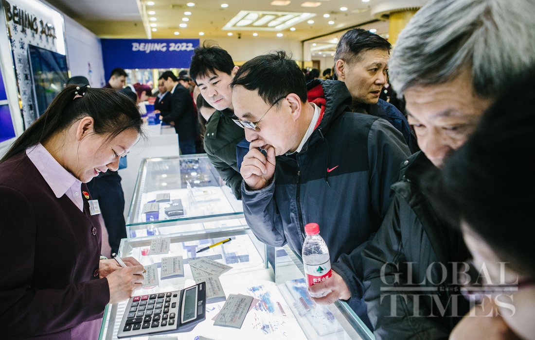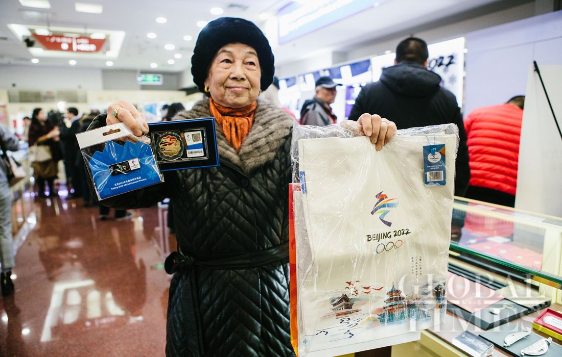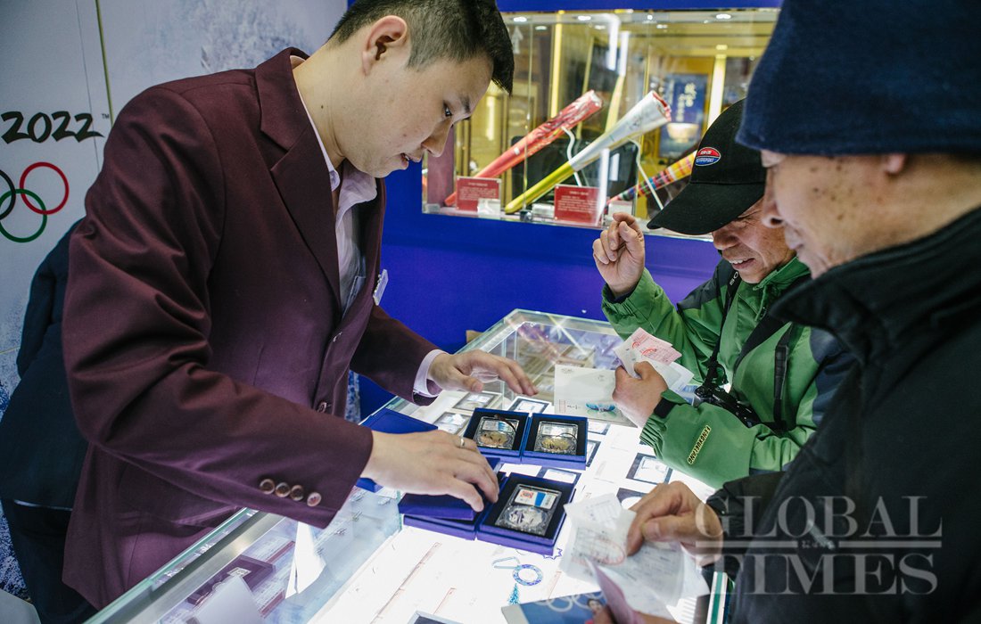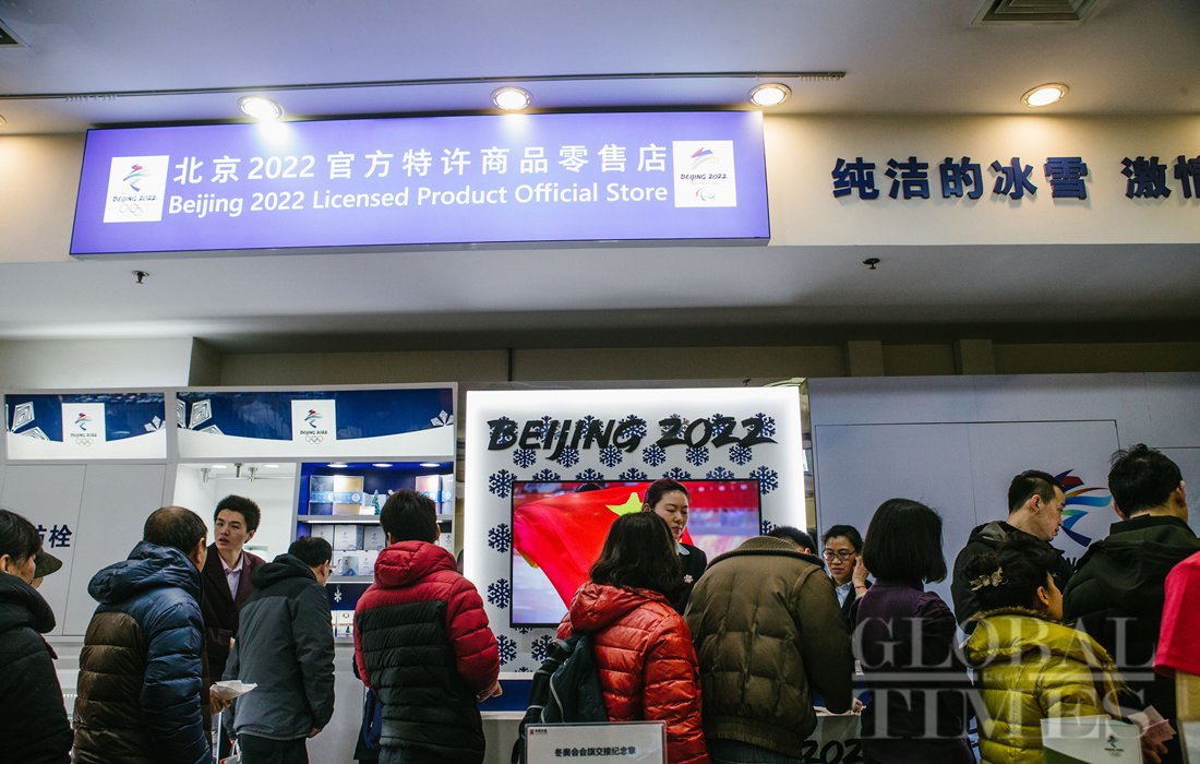 Customers browse various souvenirs for the Olympic flag handover, including badges, stamp folders and shopping bags, at an official vendor on the city's Wangfujing Shopping Street on February 25. Photo: Li Hao/GT