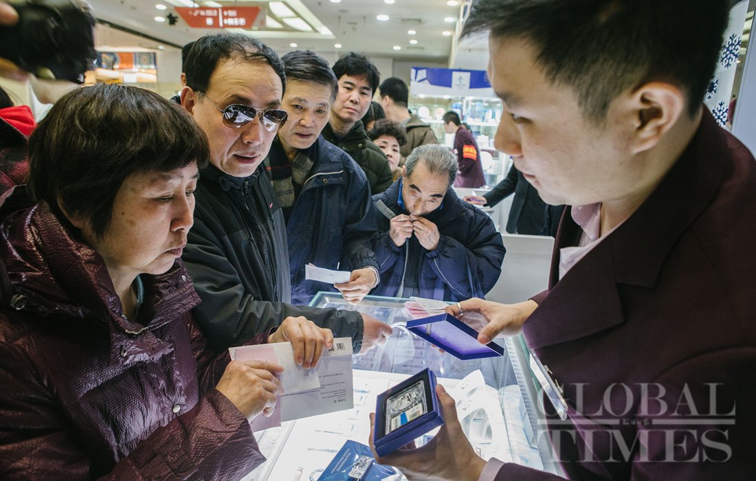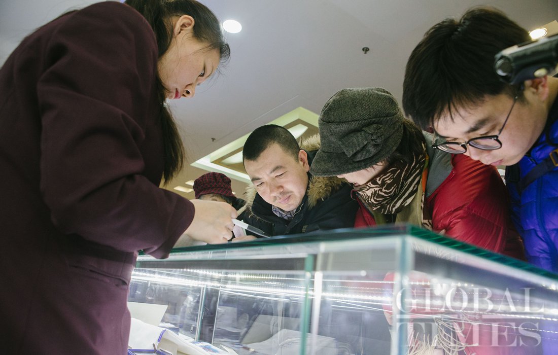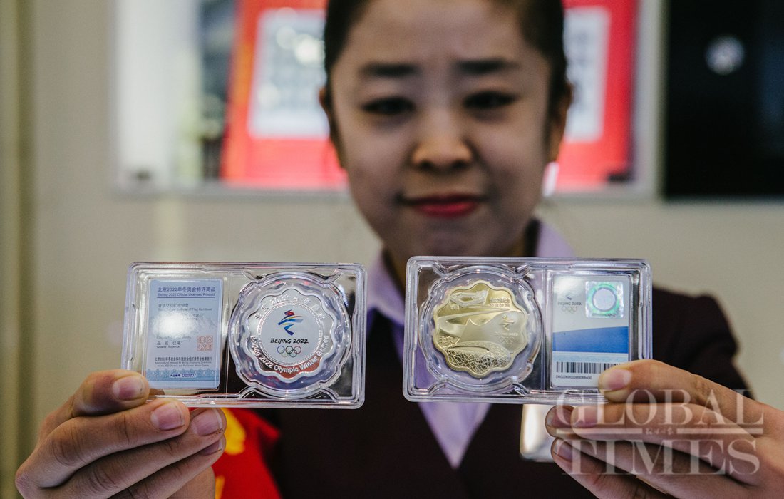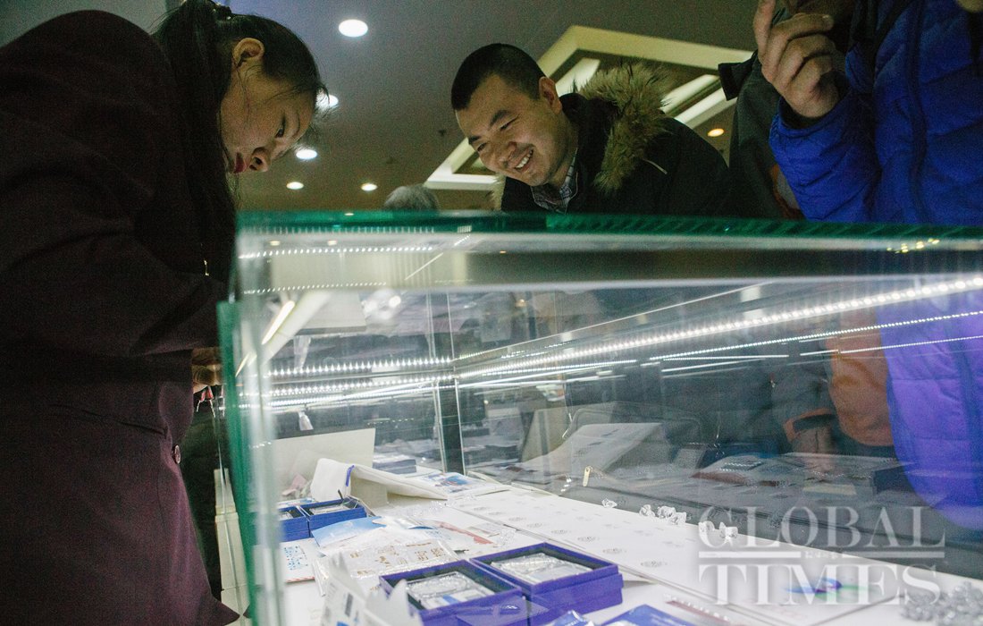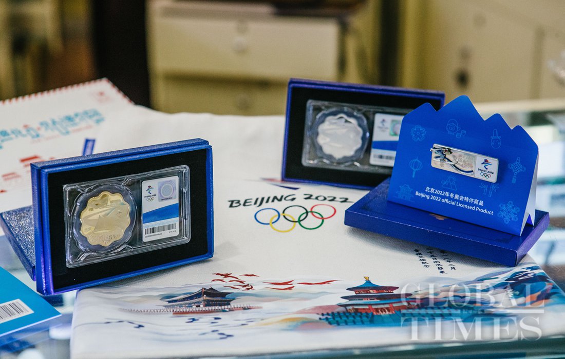 Customers browse various souvenirs for the Olympic flag handover, including badges, stamp folders and shopping bags, at an official vendor on the city's Wangfujing Shopping Street on February 25. Photo: Li Hao/GT