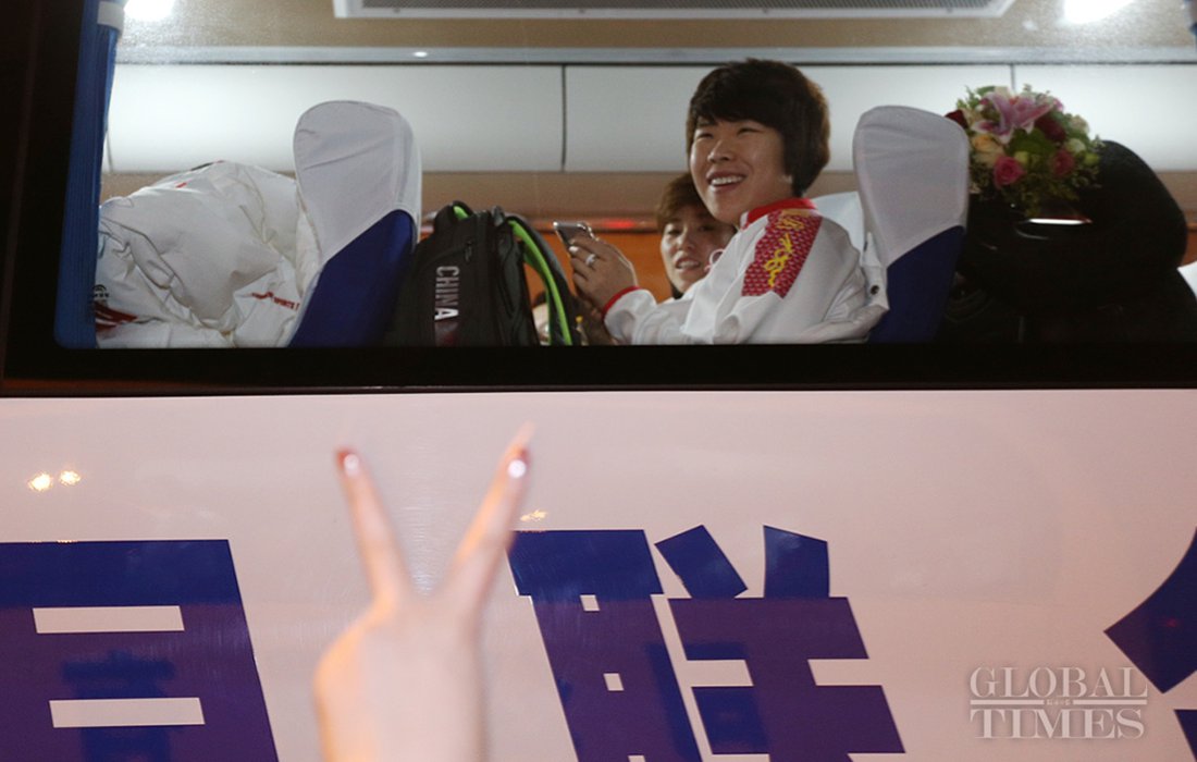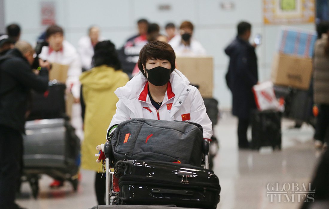 Zhou Yang, who crowned the 1500m speed skating game at both the Vancouver and Sochi Winter Olympics, arrives at the Beijing Capital International Airport with China’s short track speed skating team on Feb 26, 2018. Photo: Cui Meng/GT figcaption >