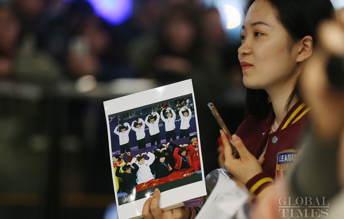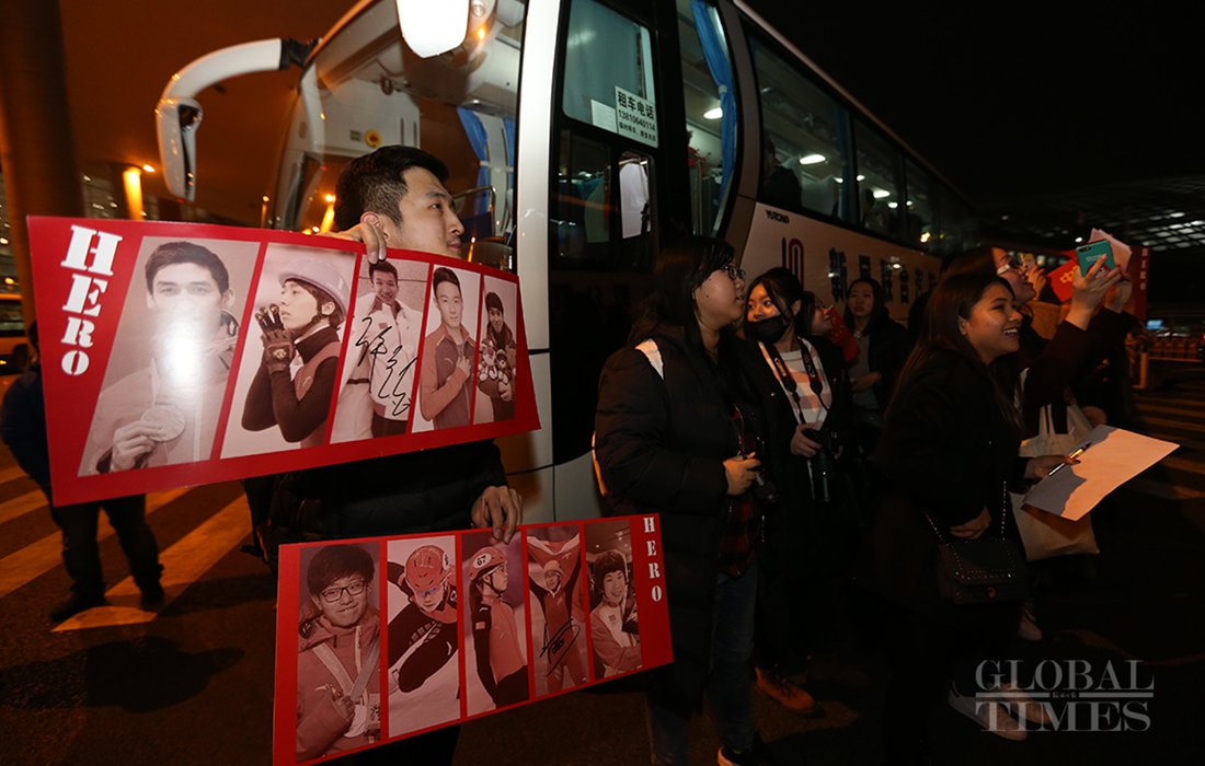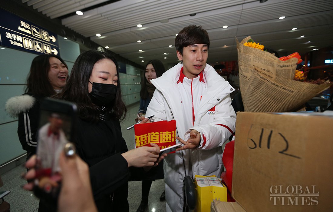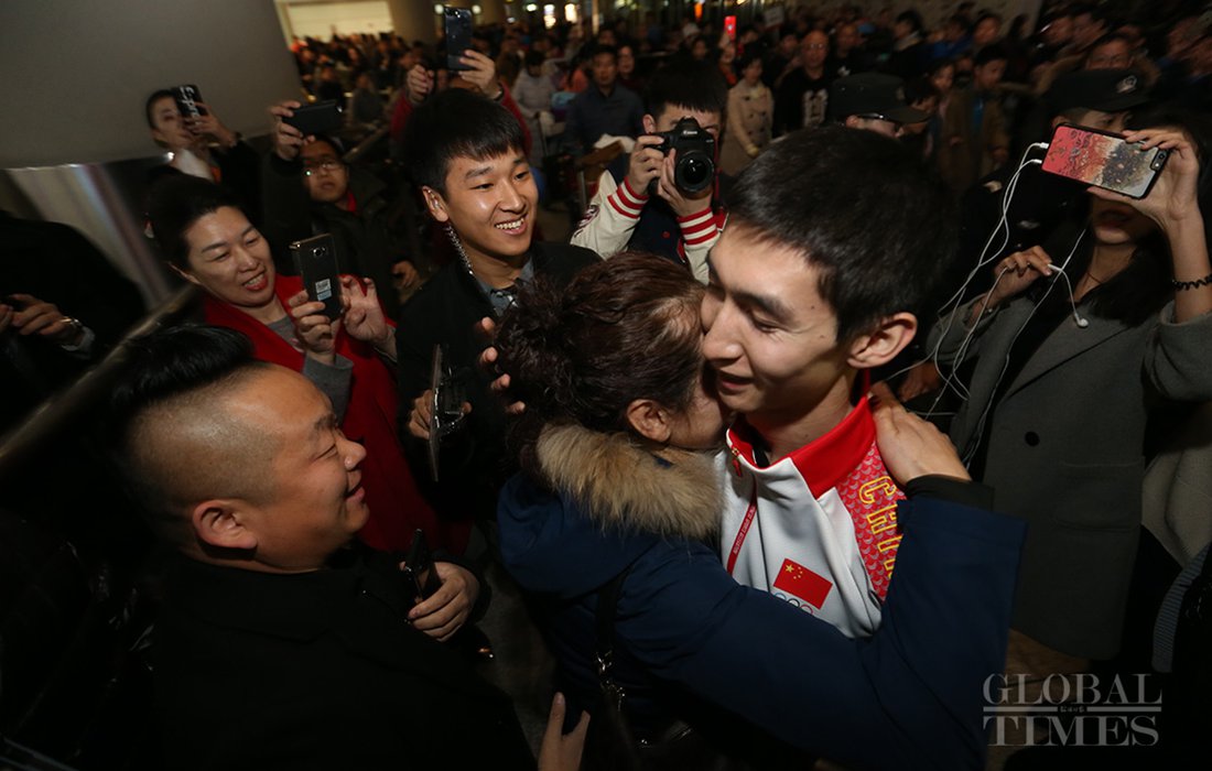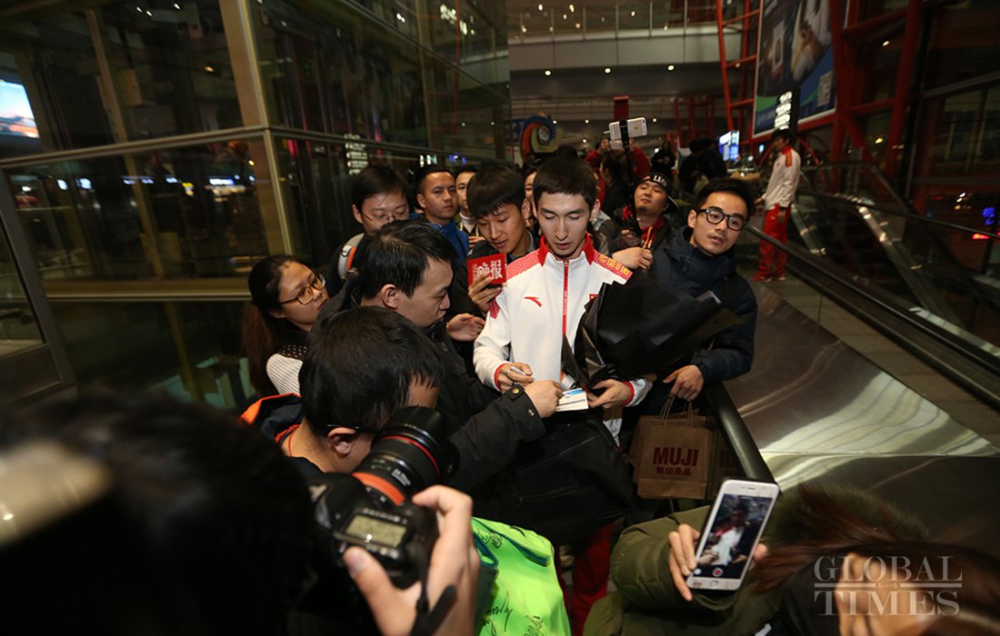 Wu Dajing, China's gold medal winner and world record breaker at the PyeongChang Olympics, receives a banquet from sports fans, when journalists took photos of him at the Beijing Capital International Airport on Feb 26, 2018. Photo: Cui Meng/GT figcaption >