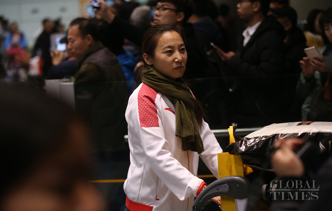 Li Yan, coach of Chinese short track speed skating team, arrives at the Beijing Capital International Airport on Feb 26, 2018. Chinese short track speed skating team won 1 gold medal and 2 silver medals at the PyeongChang Olympics. Photo: Cui Meng/GT