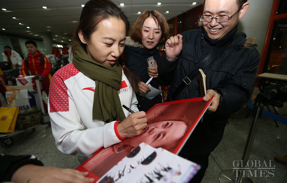 Li Yan signs on her photo for speed skating fans at the airport. Photo: Cui Meng/GT figcaption >