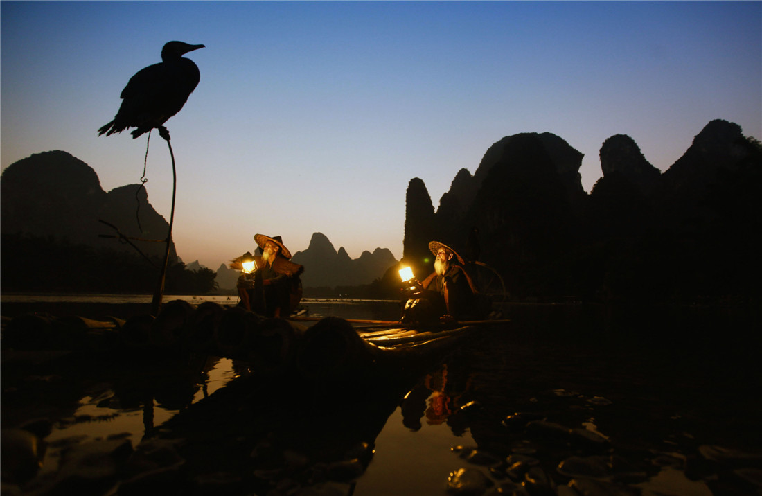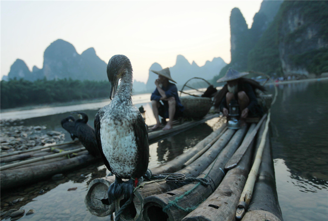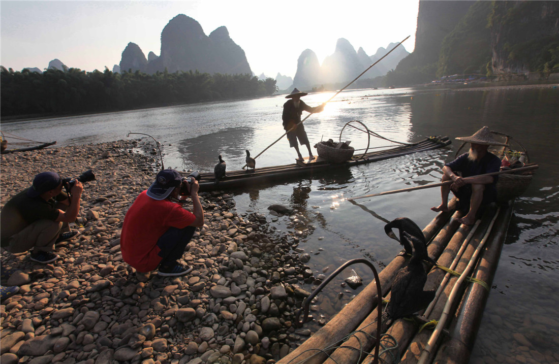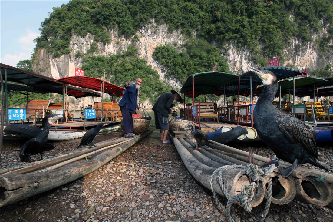 The Huang brothers wait for photographers with their trained cormorants on July 14, 2015. The species of water birds, used for centuries in China to help their masters hunt fish, make great additions to tourists’ photos. The brothers accept tens to hundreds of yuan for a photo session, depending on the offer. Photo: CFP figcaption >