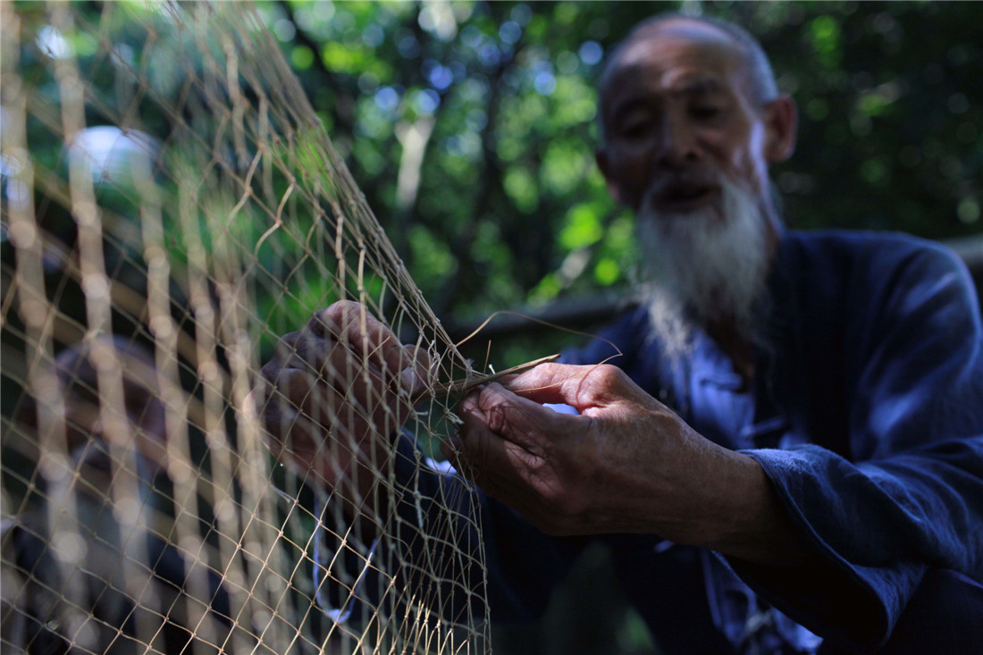 Yuechuang repairs his fishing net on July 14. He gets holes in them casting them out during photo shoots. Photo: CFP figcaption >
