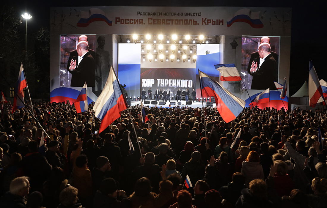 Supporters wave Russian and Crimean flags after Russian President Vladimir Putin’s speech at a rally in Nakhimov Square in Sevastopol, Crimea, on March 14, 2018 on his last official campaign day of the presidential elections. (Photo: VCG) figcaption >