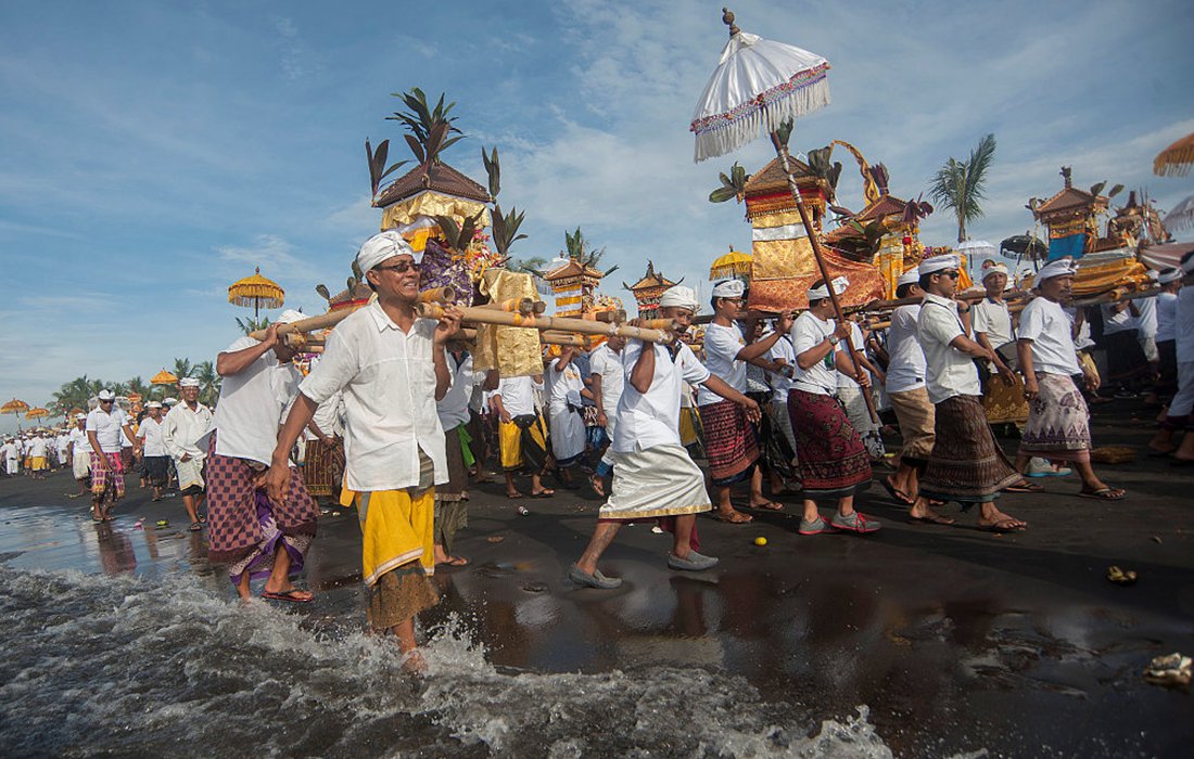 Balinese Hindus carry sacred statues of deities during a Melasti purification ceremony ahead of the holy day of Nyepi, or “Day of Silence”, in Gianyar, Bali, Indonesia, on March 14, 2018. Nyepi, New Year’s Day in the Balinese Saka Calendar, is a day of silence, fasting and meditation for the Balinese, which falls on March 17 this year. Photo: VCG