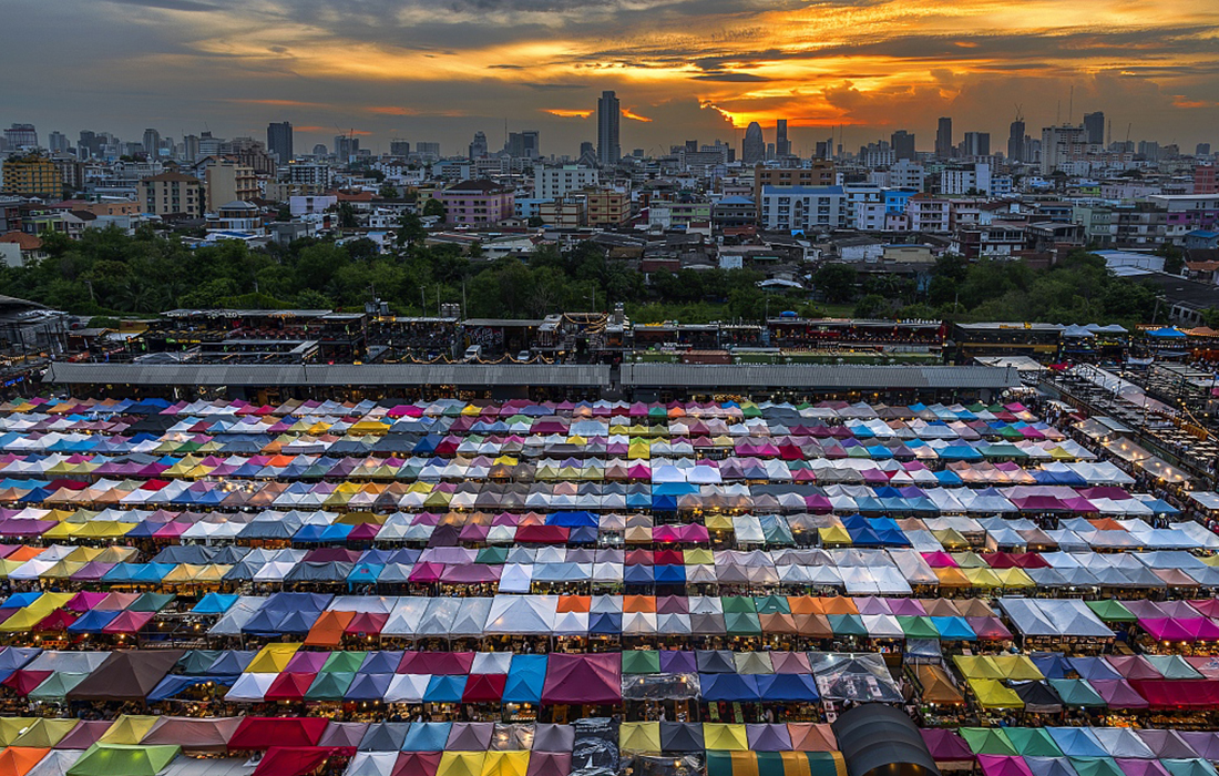 An aerial view of the Ratchada night market, made up of hundreds of multicolored stall canopies, illuminates the bleak city surroundings in Bangkok, Thailand, on March 13, 2018. (Photo: VCG)