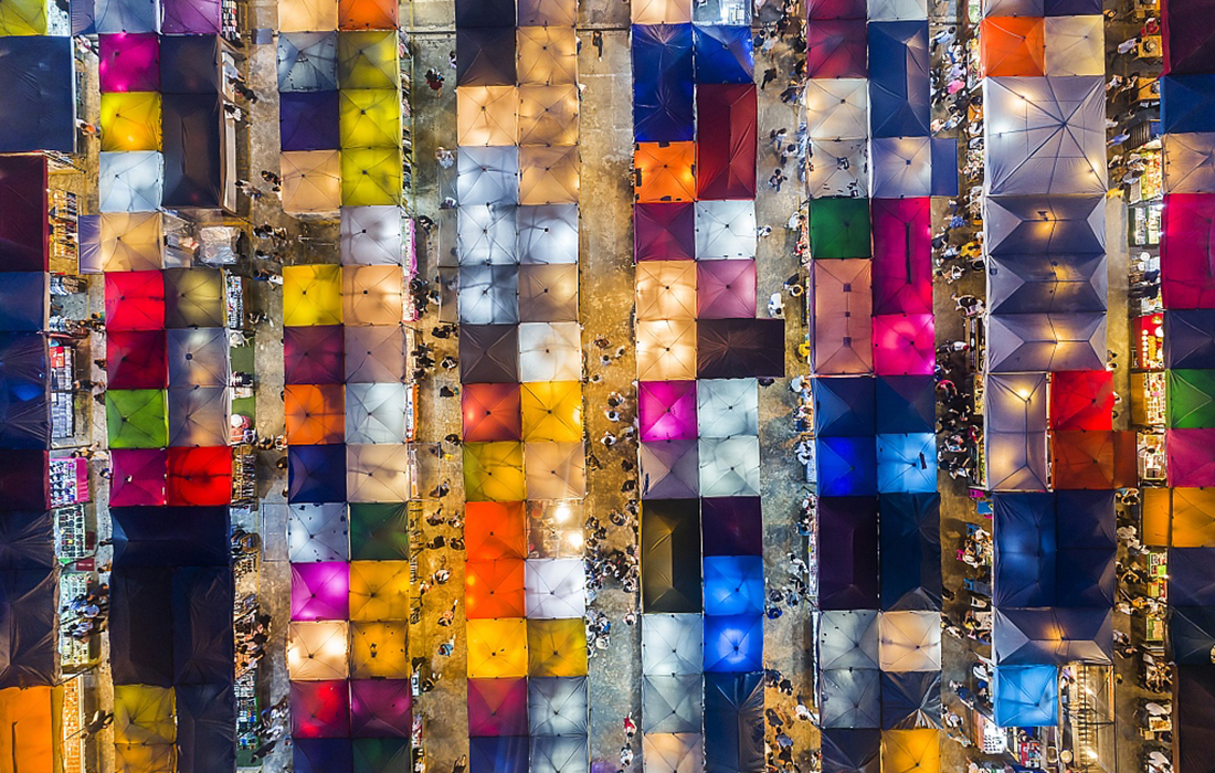 An aerial view from over 60 meters high looks down on the Ratchada night market, made up of hundreds of multicolored stall canopies, resembles the popular 80s game Tetris in Bangkok, Thailand, on March 13, 2018. (Photo: VCG) figcaption >