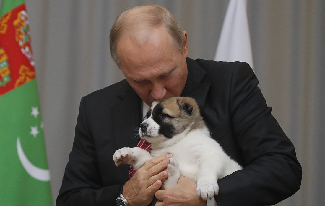 Russian President Vladimir Putin kisses a Turkmen shepherd dog, locally known as Alabai, given to him by the Turkmenistan President Gurbanguly Berdimuhamedov during a meeting in Sochi, on October 11, 2017.Photo: VCG figcaption >