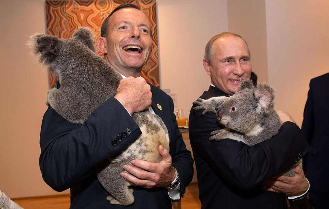 Australia's Prime Minister Tony Abbott (left) and Russia's President Vladimir Putin (right) hold a koala before the G20 Leaders' Summit in Brisbane, Australia, according to this November 15, 2014, handout photo by G20 Australia.Photo: VCG figcaption >