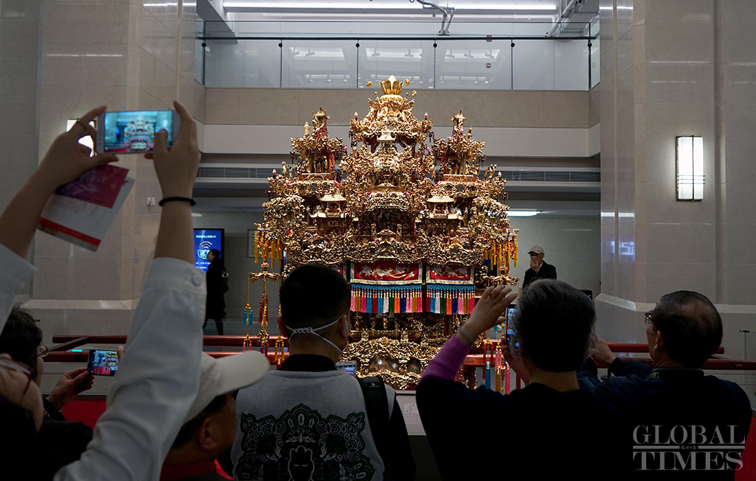 Visitors take photos of the most precious treasure of the museum, a wood carving sedan chair carried by eight people dated back to Ming Dynasty (1368-1644). Photo: Yang Hui/GT figcaption >