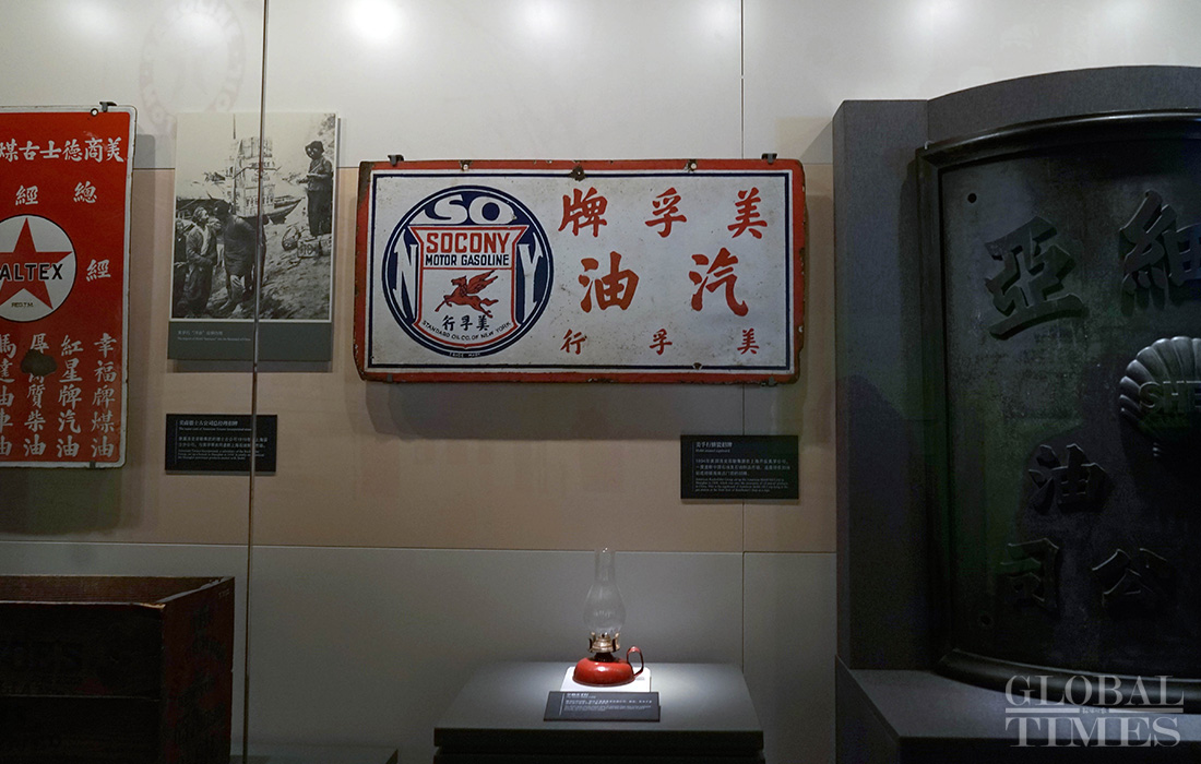 A signboard of Mobil Gasoline, which entered Shanghai before 1949, is on display in the Shanghai History Museum on March 26, 2018. Photo: Yang Hui/GT figcaption >