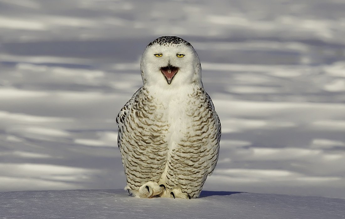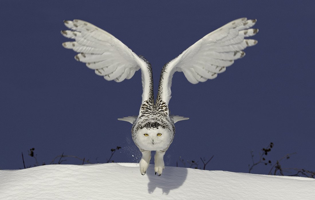 A beautiful snowy owl glides inches above the snow in a hunt for voles in Ottawa, Ontario, Canada. The owl’s dark markings on its feathers delude the voles and help it better fit in with the surroundings.