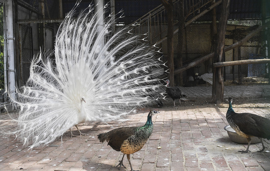 A male white peacock fans his stunning tail feathers to attract a mate at the Jinan Zoo, East China’s Shandong Province on March 28, 2018. Contrary to popular belief, white peacocks are not albinos. Instead, they have a genetic condition called leucism that causes a reduction in feather pigments. Photo: VCG