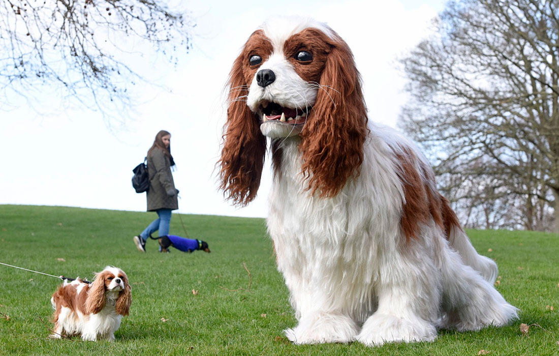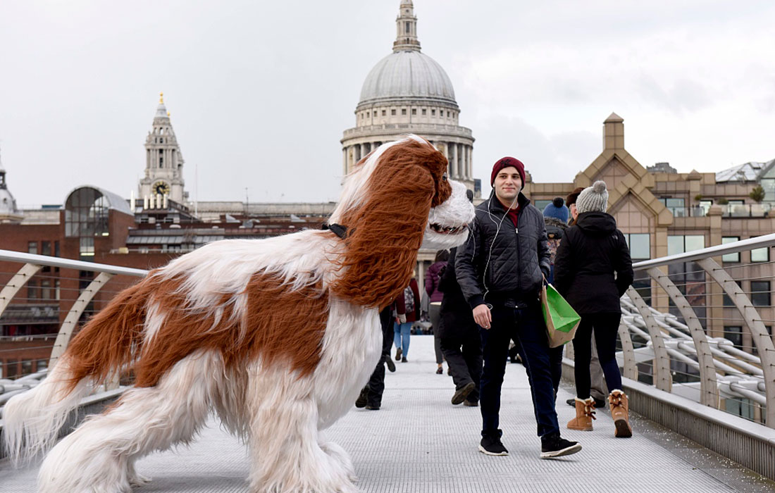 A 1.6-meter-tall animatronic dog astonished onlookers in London, UK on March 28, 2018. It took a team of ten technicians at special effects company Artem around 2,000 hours to create the giant Cavalier King Charles Spaniel, which requires three puppeteers to operate. The hi-tech pup was sponsored by a flea treatment brand Frontline Plus in a bid to encourage owners to keep their pets protected. Photos: VCG