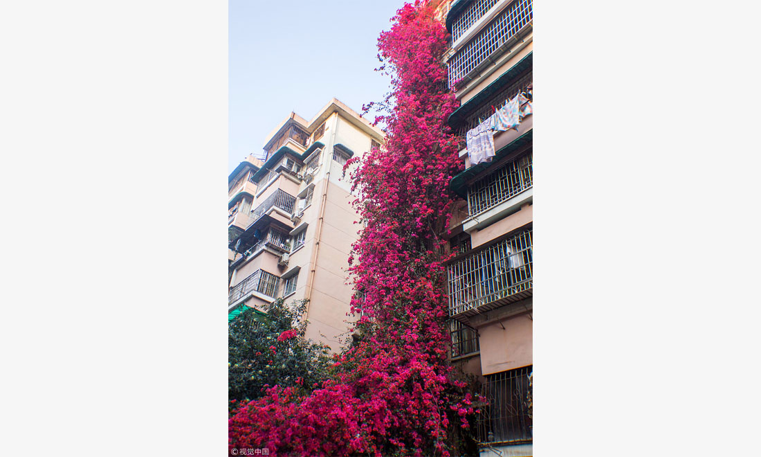 A 20-year-old azalea tree climbs an apartment building all the way to the ninth floor in the Baiyun district of Guangzhou, South China's Guangdong Province. The beautiful floral cascade blooms into a carnival of magenta in spring.