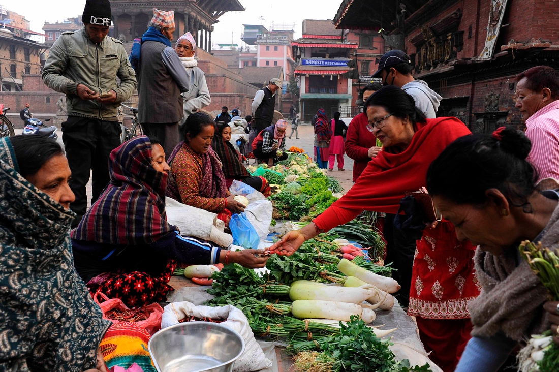 Nepalese people buy fruits and vegetables from a farmer’s market in Nepal on March 22, 2018. Photo: Zhang Jiaxiang