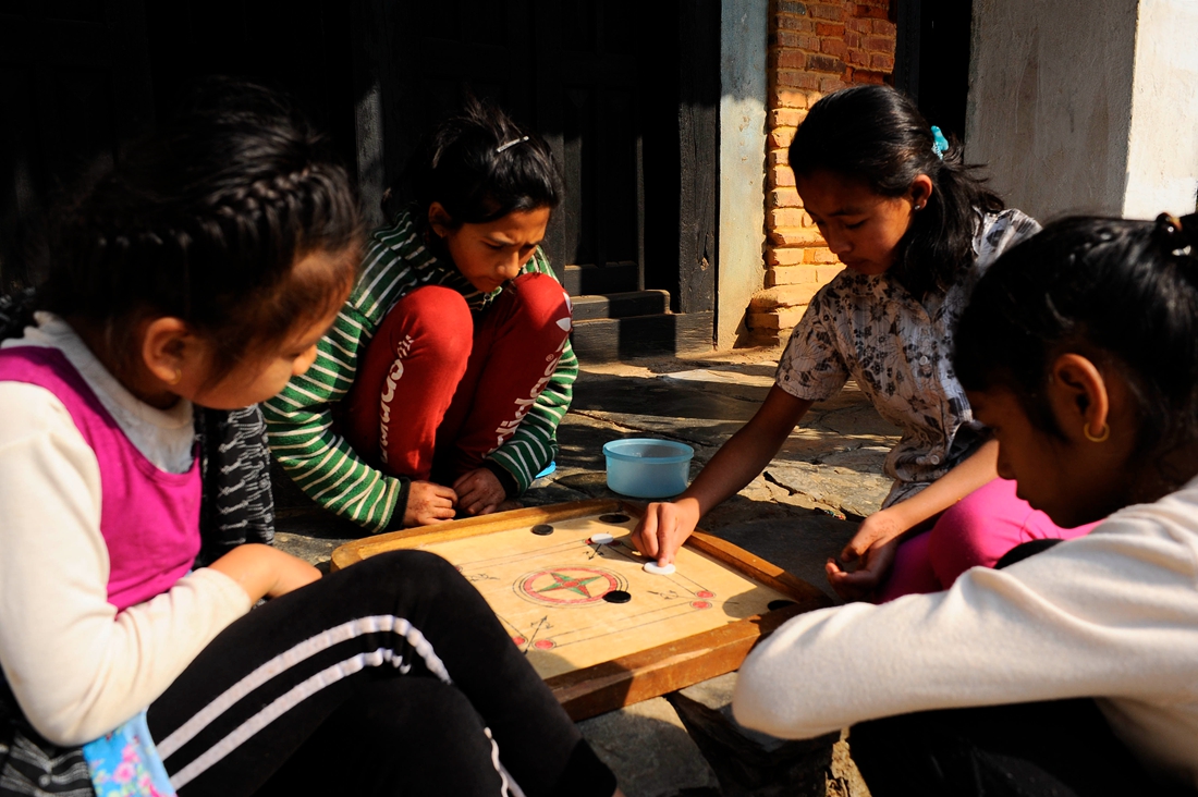 Nepalese girls play Carrom Board in front of their houses in Bandipur in Nepal on March 19, 2018. Photo: Zhang Jiaxiang figcaption >
