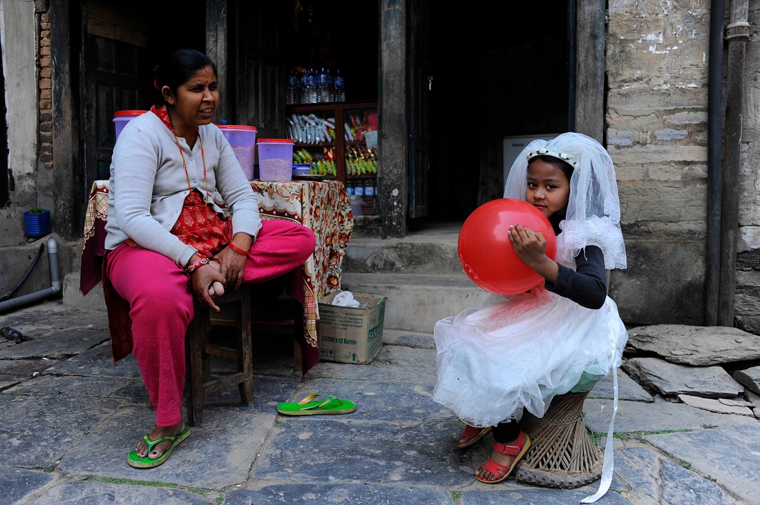 A 7-year-old Nepalese girl sits with her grandmother while she wears a white wedding dress so as to “marry” Bael fruits on her birthday in Nepal on March 19, 2018. Photo: Zhang Jiaxiang figcaption >