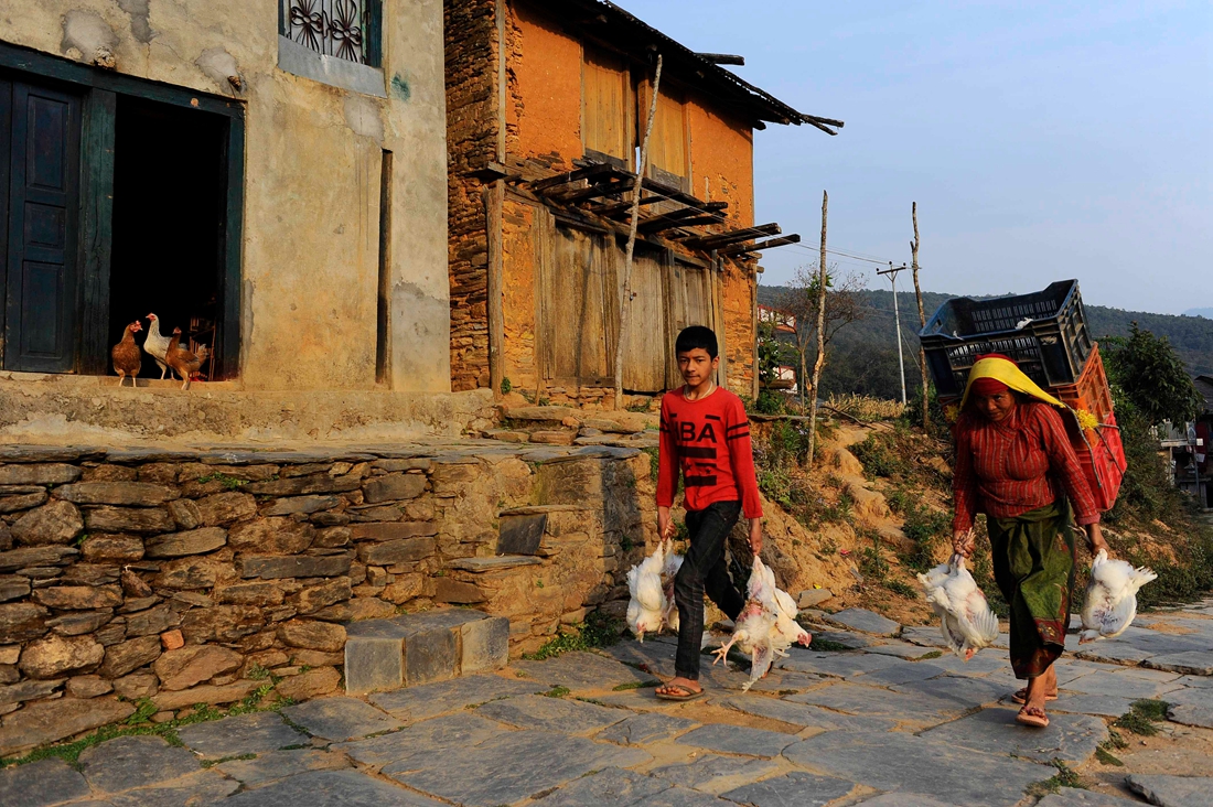 A Nepalese boy and his mother bring some chickens bought from a farmer’s market home in Nepal on March 19, 2018. Photo: Zhang Jiaxiang figcaption >