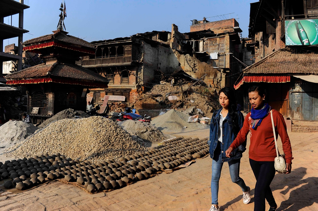 Nepalese girls walk by some ruins of old buildings that were hit by a deadly earthquake in 2015. Photo: Zhang Jiaxiang figcaption >