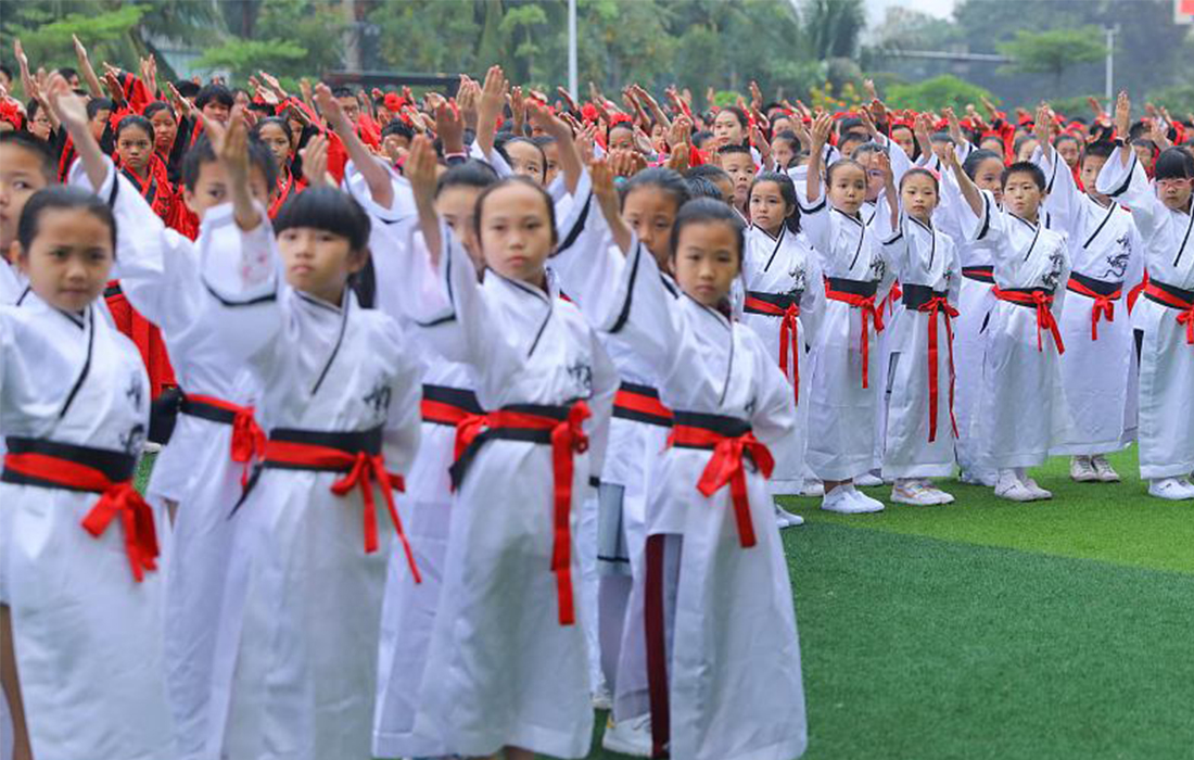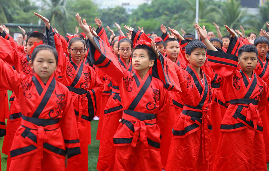 Students perform in Han-style costumes for the upcoming World Book Day on the playground of Yusha Experimental School in Haikou, Hainan Province, China, on April 18, 2018. Photo: VCG