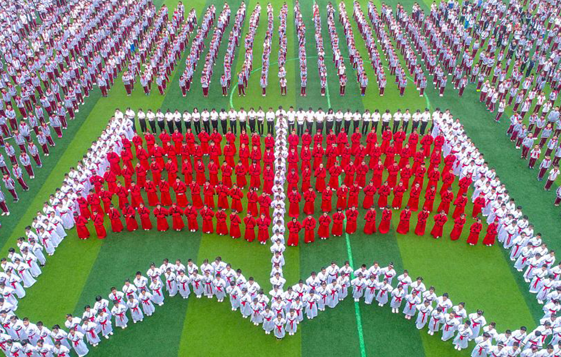Nearly 400 teachers and students wearing Han-style costumes form a ‘giant book’ and read ancient classical poetry for the upcoming World Book Day on the playground of Yusha Experimental School in Haikou, Hainan Province, China, on April 18, 2018. Photo: VCG