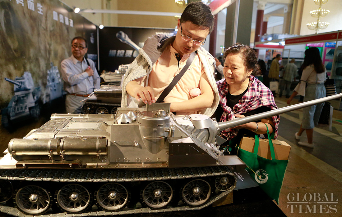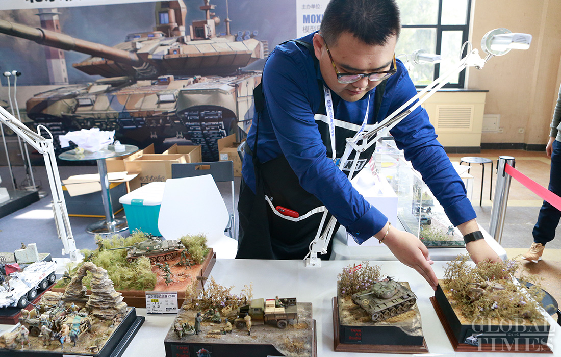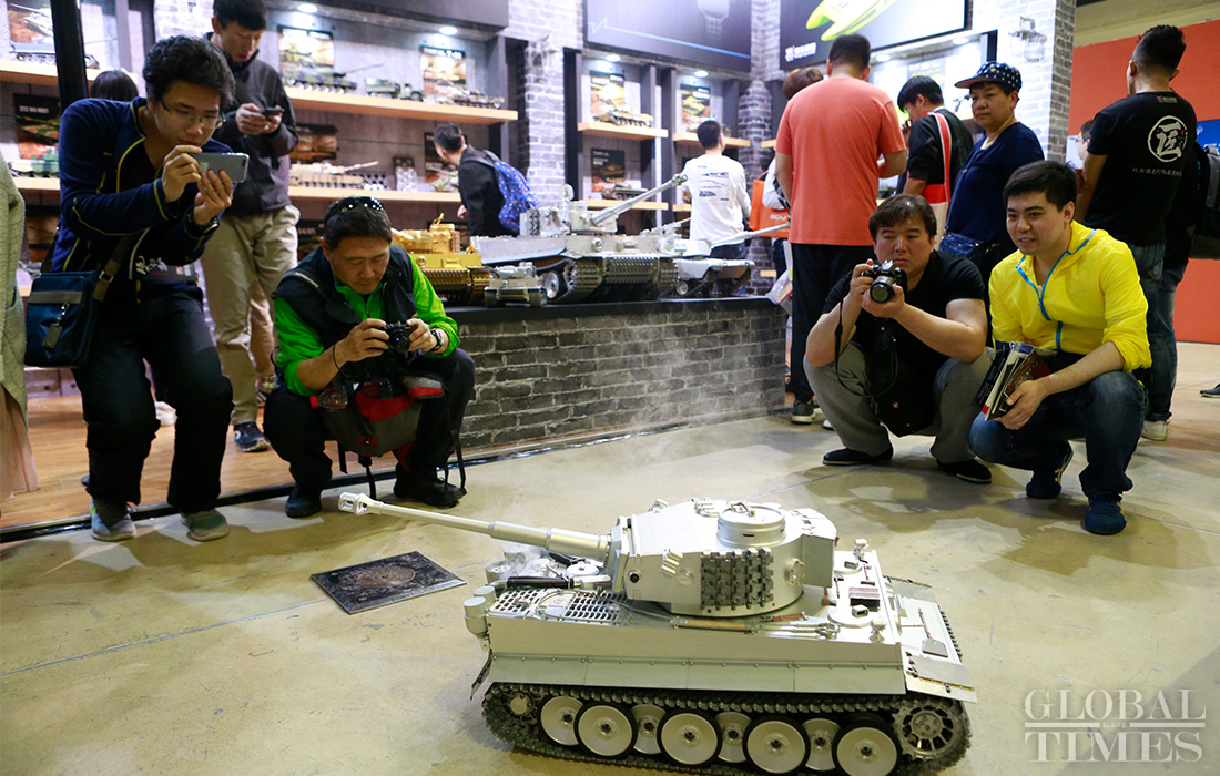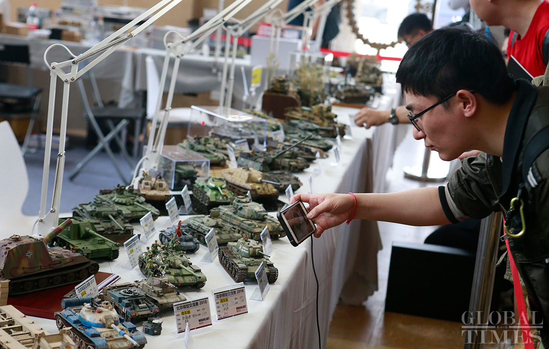 Visitors enjoy studying a model tank during the 19th Hobby Expo China at the Beijing Exhibition Center on April 20, 2018. Photo: Li Hao/GT figcaption >