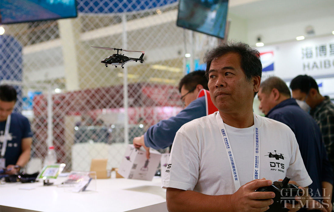 An exhibitor demonstrates flying a remote control model helicopter. Photo: Li Hao/GT figcaption >