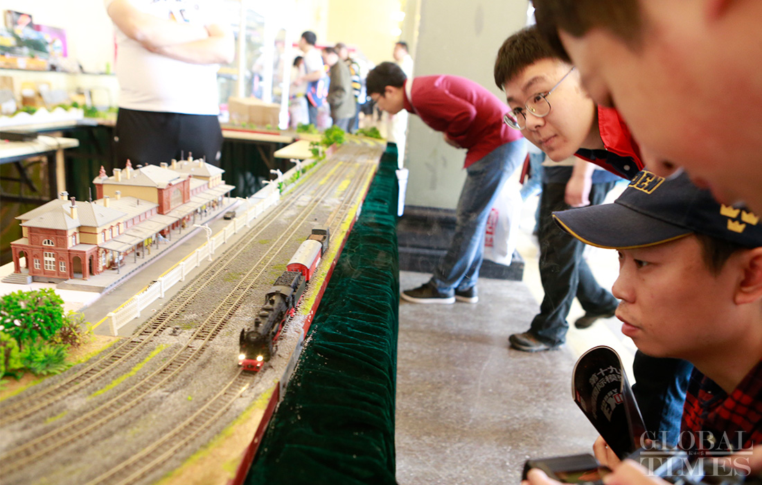 Visitors watch a model train moving around the tracks. Photo: Li Hao/GT figcaption >