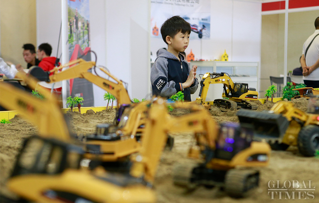 A child checks out excavator models during the 19th Hobby Expo China at the Beijing Exhibition Center on April 20, 2018. Photo: Li Hao/GT figcaption >