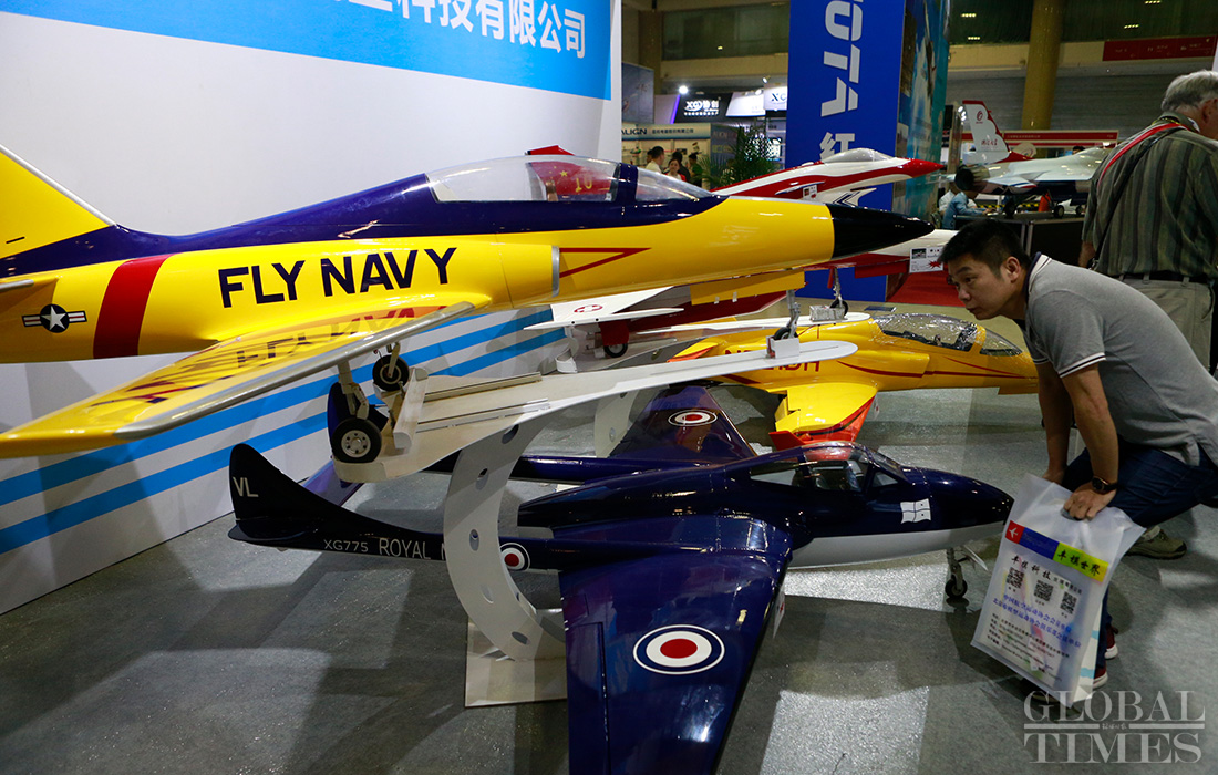 An exhibitor shows a visitor a model aircraft during the 19th Hobby Expo China at the Beijing Exhibition Center on April 20, 2018. Photo: Li Hao/GT figcaption >